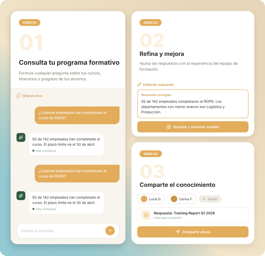 Tu equipo recibe respuestas formativas en el momento exacto en que las necesita aplicar. La teoría del curso se convierte en práctica diaria sin tener que volver a abrir el manual.