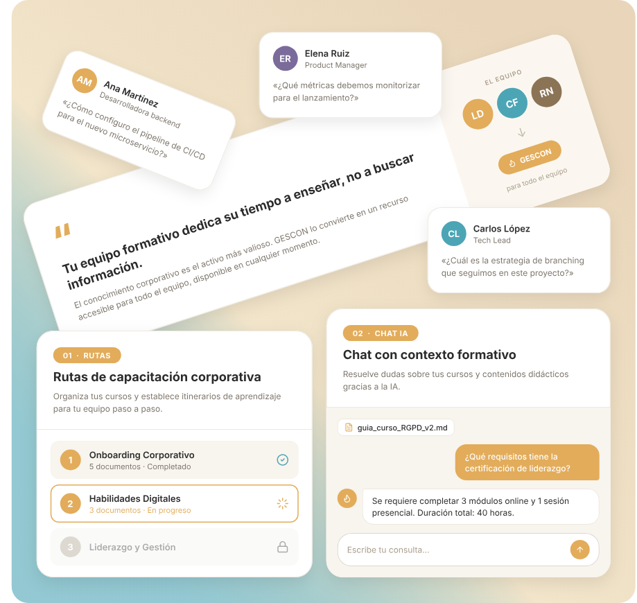 Tu equipo no debería olvidar el 70% de lo aprendido en una semana. GESCON conecta tus materiales formativos a una IA que ayuda a empleados y formadores en segundos, con respuestas trazables y alineadas con tu plan de desarrollo.