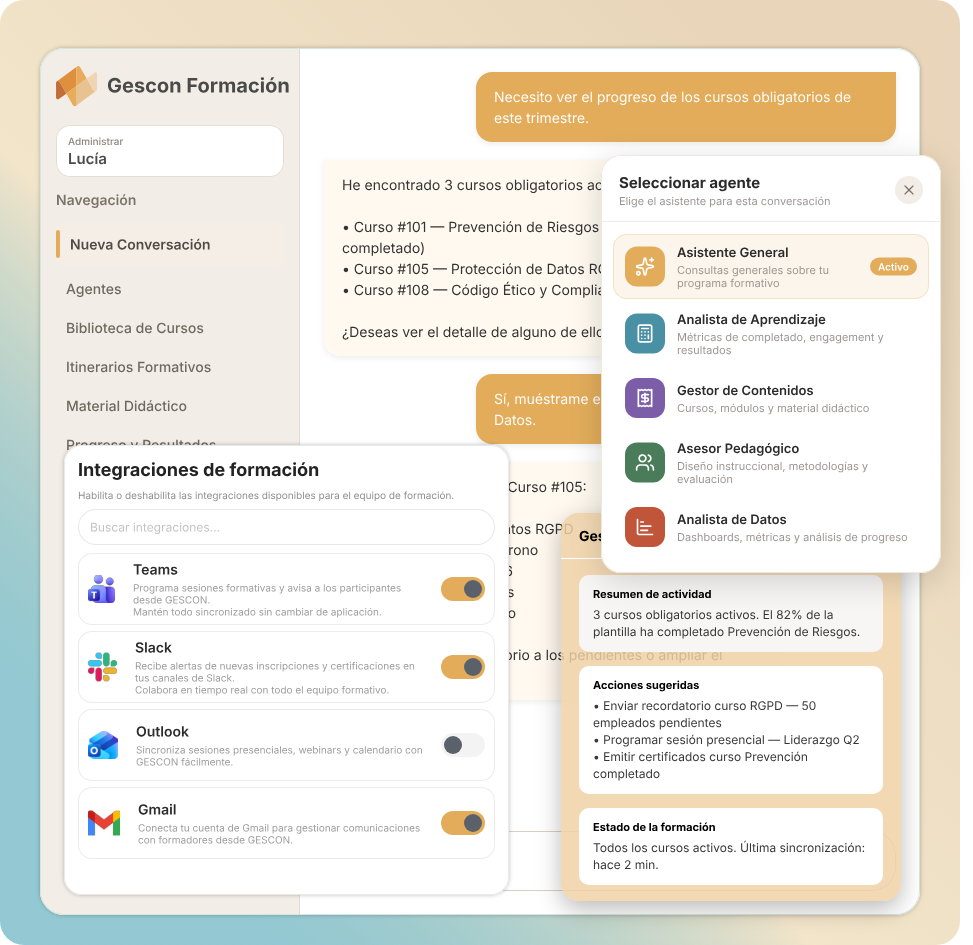 Inserta el asistente en tu intranet, LMS o herramientas habituales para que tu equipo refuerce conceptos sin esperar al próximo curso.