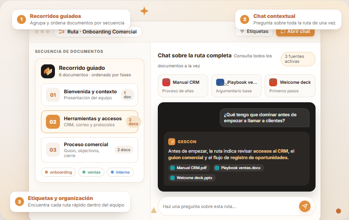 Agrupa y ordena documentos en secuencias para onboardings, formaciones o procesos internos.