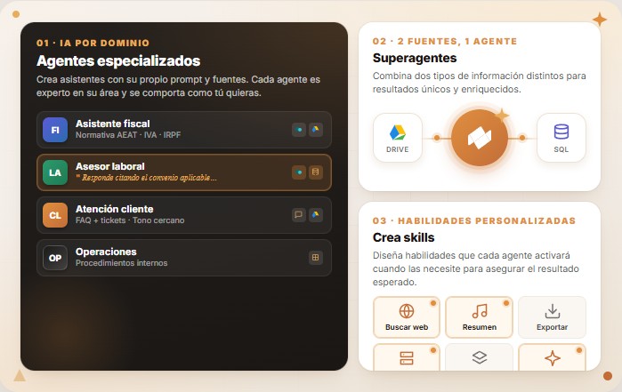 Crea asistentes con su propio prompt y fuentes de datos. Cada agente es un experto en su área que se comporta como tu quieras.