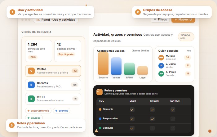 Visualiza qué agentes se usan más, quién consulta y con qué frecuencia. Datos para decisiones de gerencia.