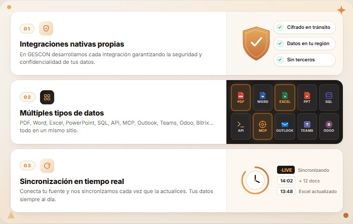 Sincronizamos diferentes fuentes de datos: PDF, Word, Excel, Power Point, SQL, API, MCP e Outlook, Teams, Odoo, Bitrix, etc.