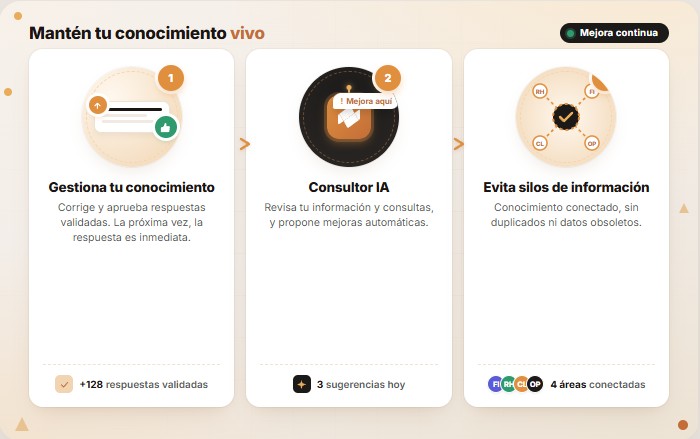 Corrige respuestas y aprueba respuestas validadas por tu equipo. La próxima vez que alguien pregunte, la respuesta es inmediata.