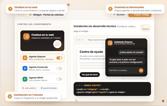 Lleva tu conocimiento allá donde quieras. Exporta un asistente con tu información a cualquier página web, intranet o portal de clientes.